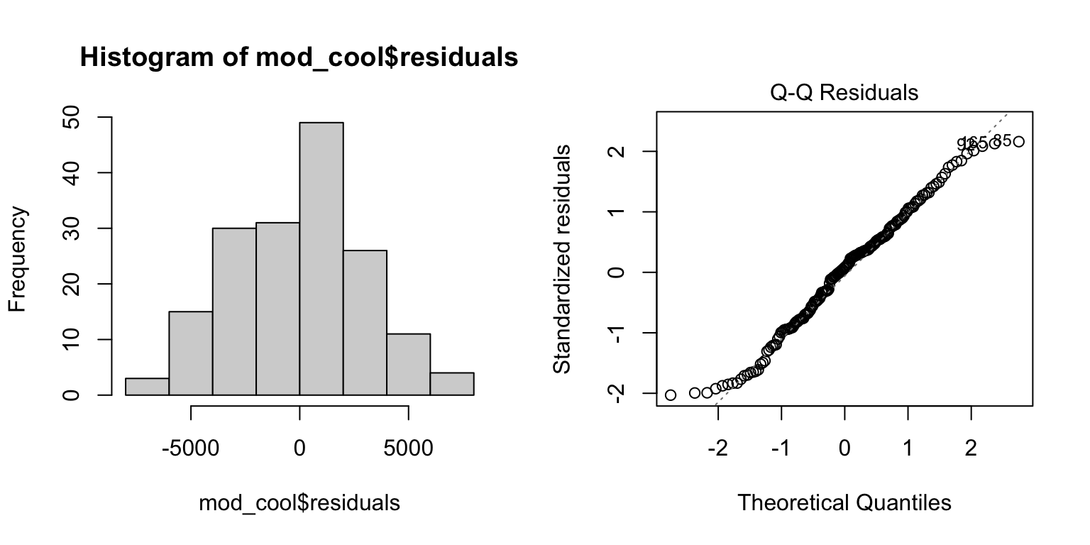 assumptions and drop the Q-Q plot.par(mfrow = c(1, 2)) # This code put two plots in the same window