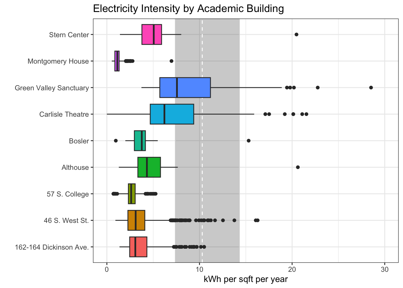 labs(x = "", y = "kWh per sqft per year", title = "Electricity Intensity by Academic Building") +