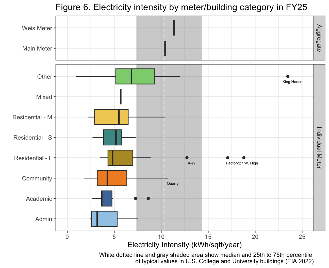 Looking at the entire fiscal year, electricity intensity (use per square foot of space) varied across building categories for individually metered buildings (Table 2, Figure 5). Administrative buildings had the lowest electricity intensity with a median of 3.2 kWh/sqft (interquartile range 2.6-5.3 kWh/sqft), while the ‘Mixed’ category of buildings had the highest value at 15.6 kWh/sqft (interquartile range 10.7-20.6 kWh/sqft). Importantly, the ‘Mixed’ category includes Kaufman Hall, which houses the campus central energy plant and supplies heat and cooling to other buildings on campus. That said, electricity intensity for most individually metered buildings was substantially below typical values for U.S. Colleges and Universities as reported by the U.S. Energy Information Administration (EIA 2022).