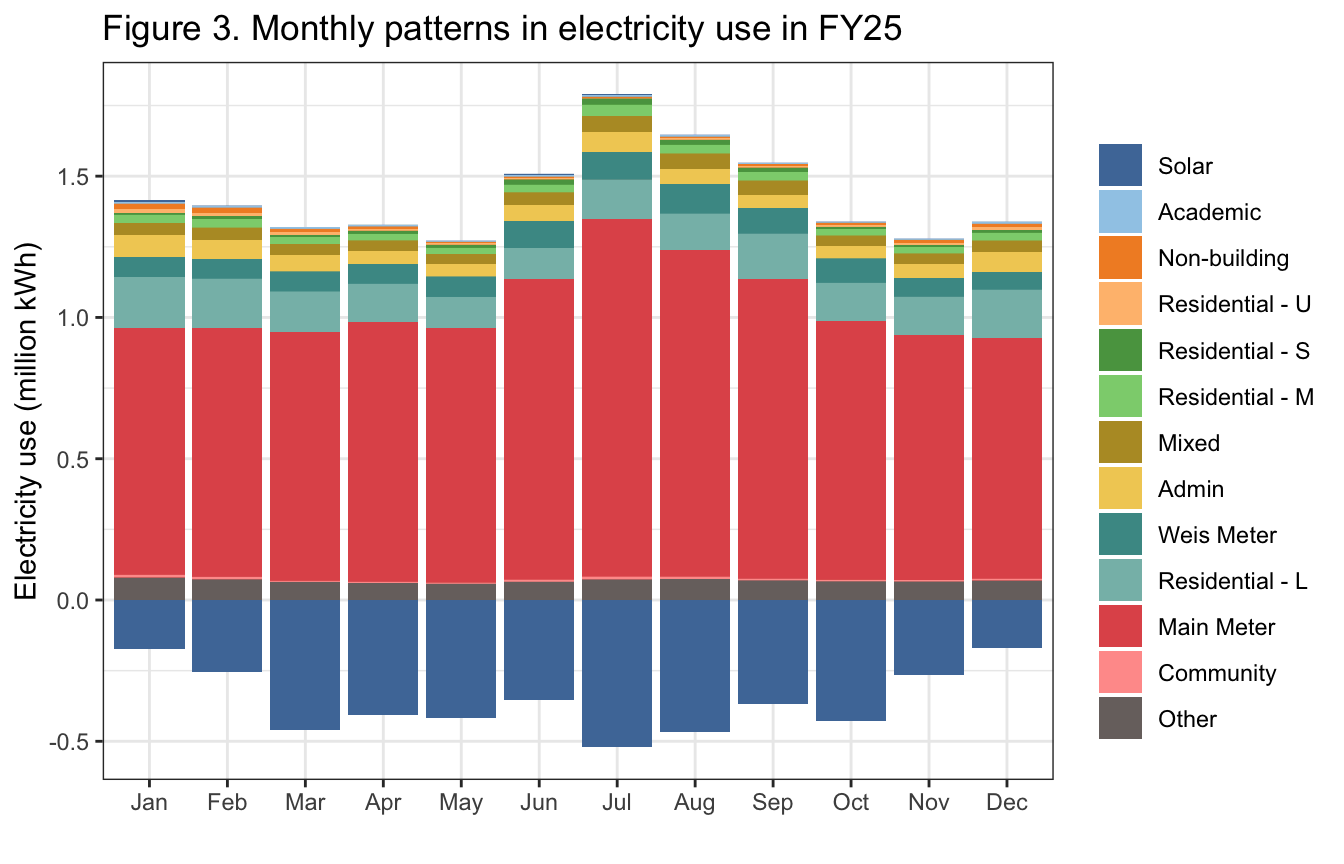 Electricity use peaked in July and was lowest in May and November (Figure 3). At all times of year, buildings on the main meter accounted for most of the electricity use, and the main meter buildings appeared to drive the seasonal pattern (Figure 4). Of the individually metered buildings, large residence halls accounted for the largest share of electricity use and peaked in winter (Figure 5). Interestingly, electricity production through the solar field peaked in July and was lowest in December and January (Figure 3).