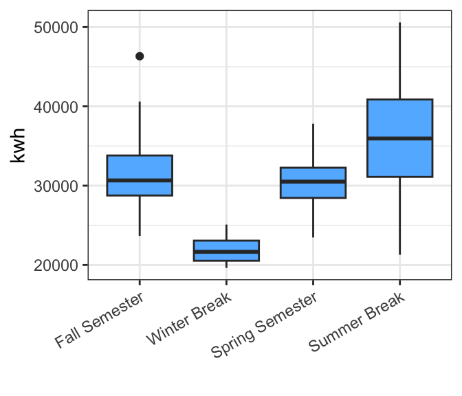 The intercept here represents the mean electricity use during fall semester, the first level in our categorical variable. The coefficients for the other periods represent the average difference between them and electricity use in fall. For example, electricity use during winter break appears to be about 9563 kWh less per day than in fall. The P values next to the individual coefficients tell us that electricity use during winter and summer break is significantly different from fall semester (P < 0.001), whereas electricity use in fall and spring are marginally different (P 0 0.08).