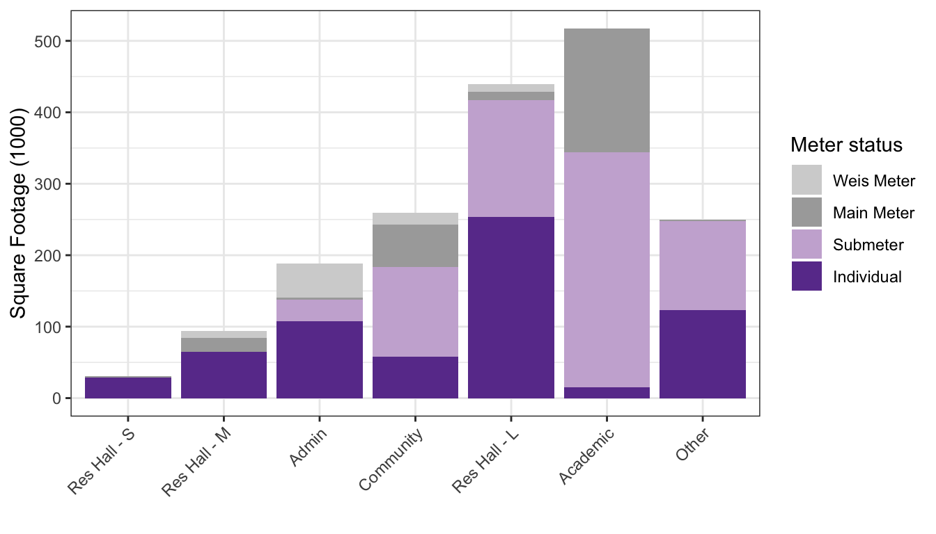 labs(x = "", y = "Square Footage (1000)", fill = "Meter status") +