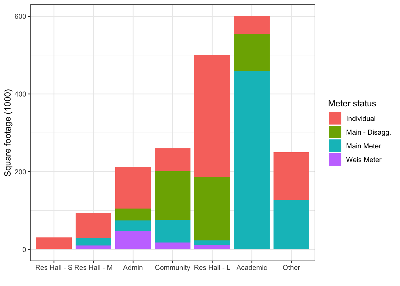labs(x = "", y = "Square footage (1000)", fill = "Meter status")