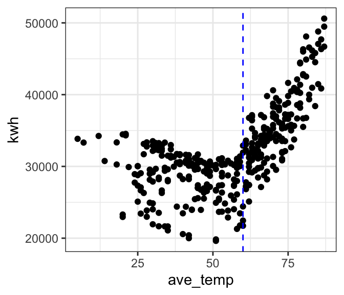 this break point to find the one that best fits the data.mod_full <- lm(kwh ~ ave_temp, data = daily_main)