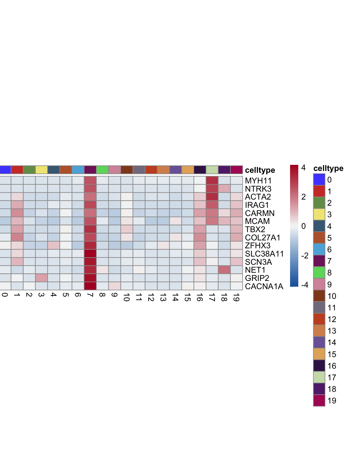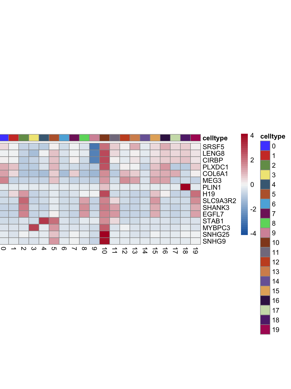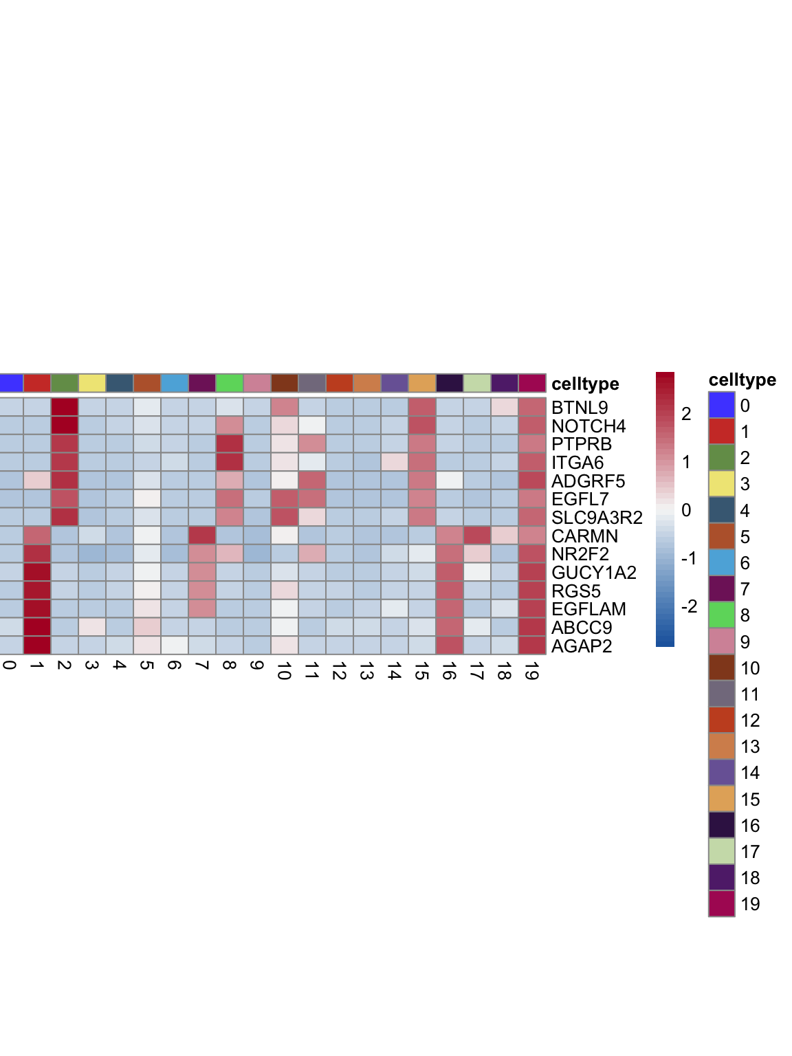 "pOut <- avgHeatmap(seurat = seurat, selGenes = selGenes,