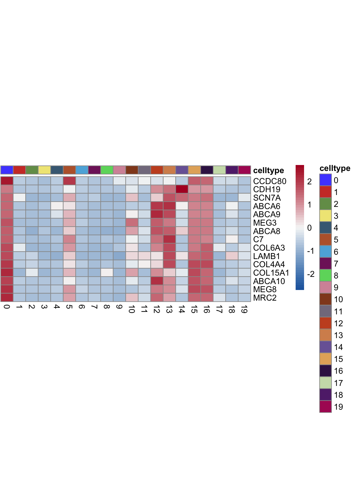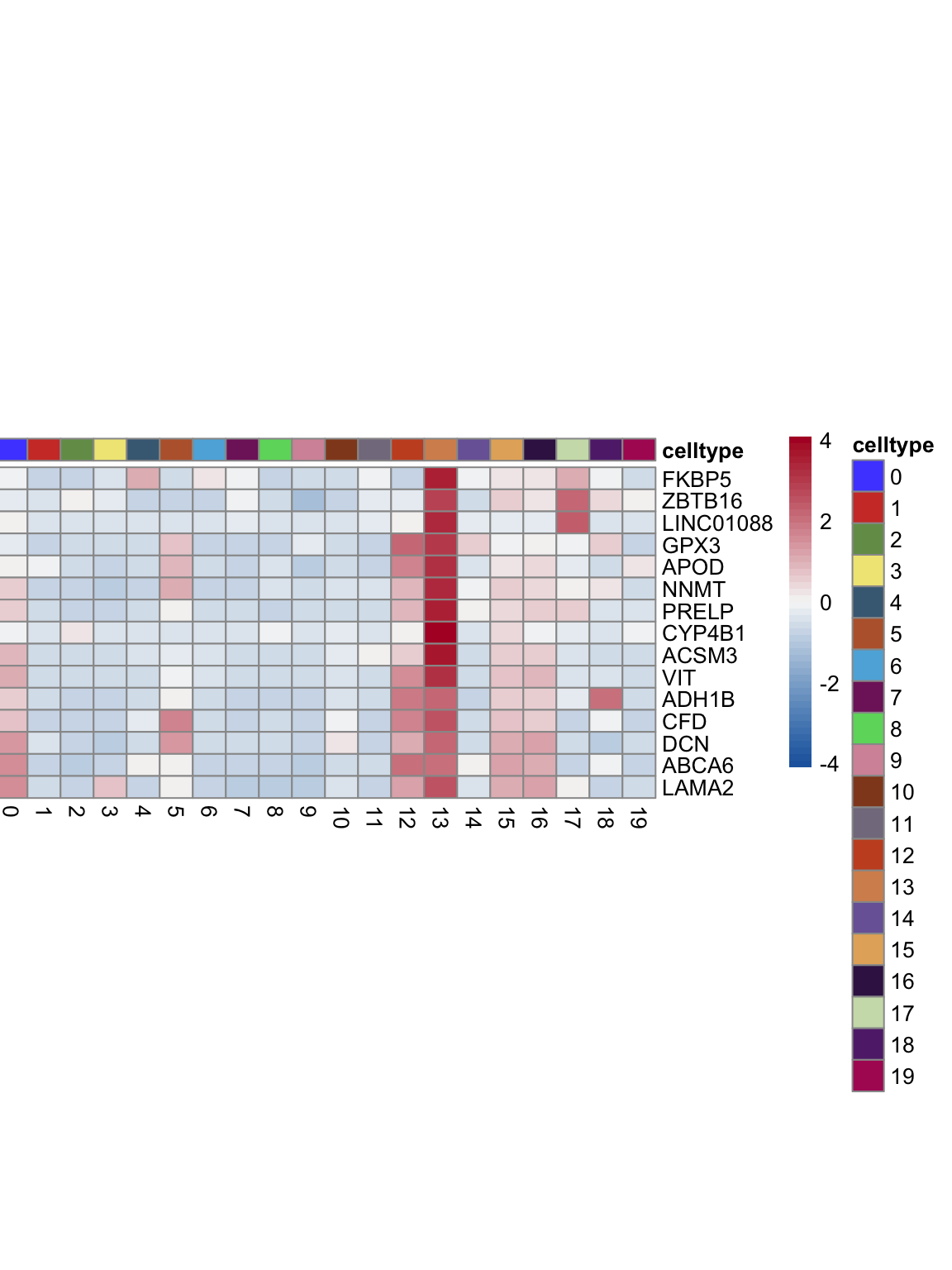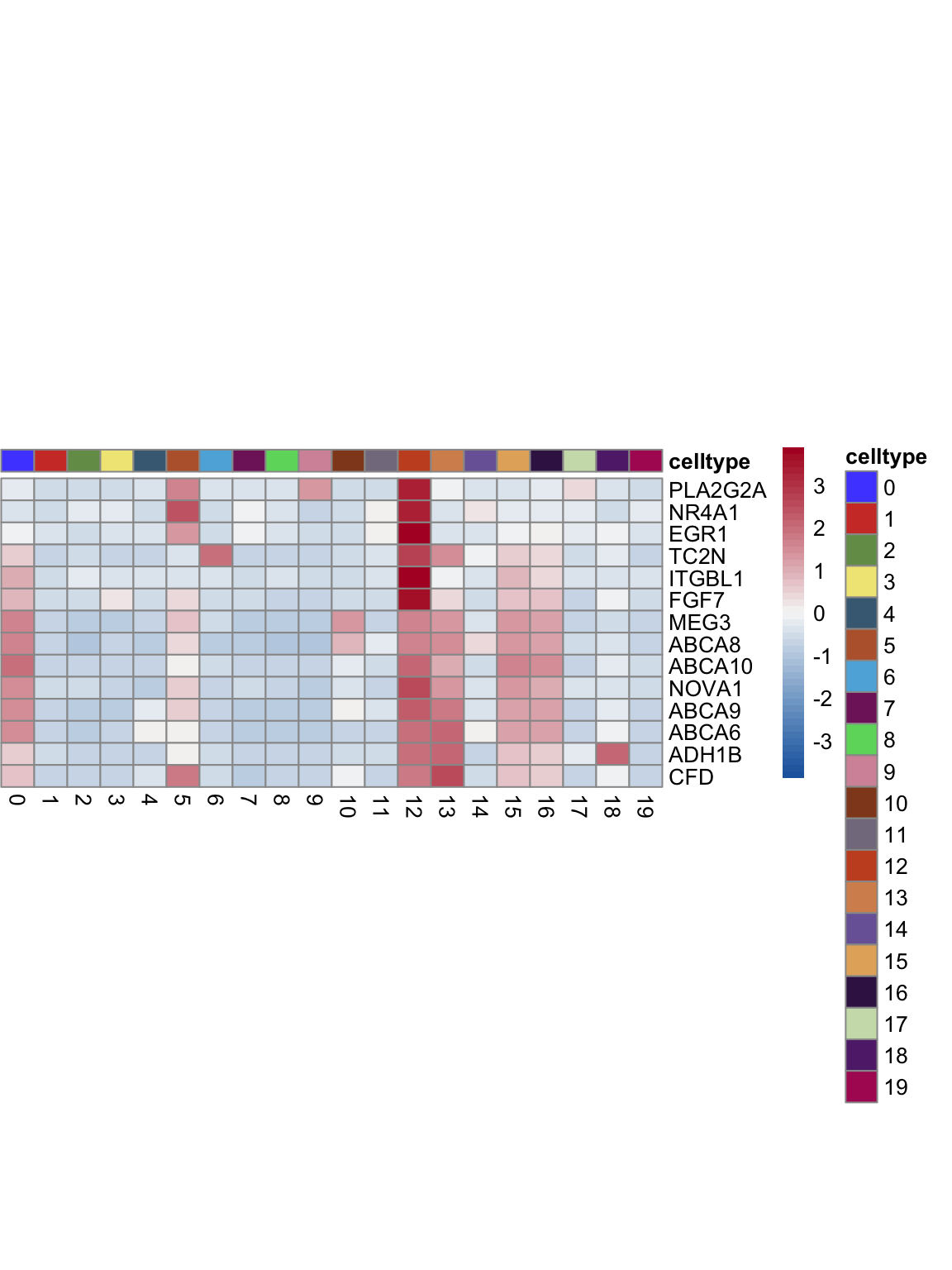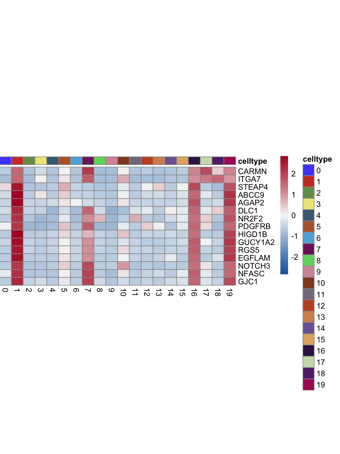 "pOut <- avgHeatmap(seurat = seurat, selGenes = selGenes,
