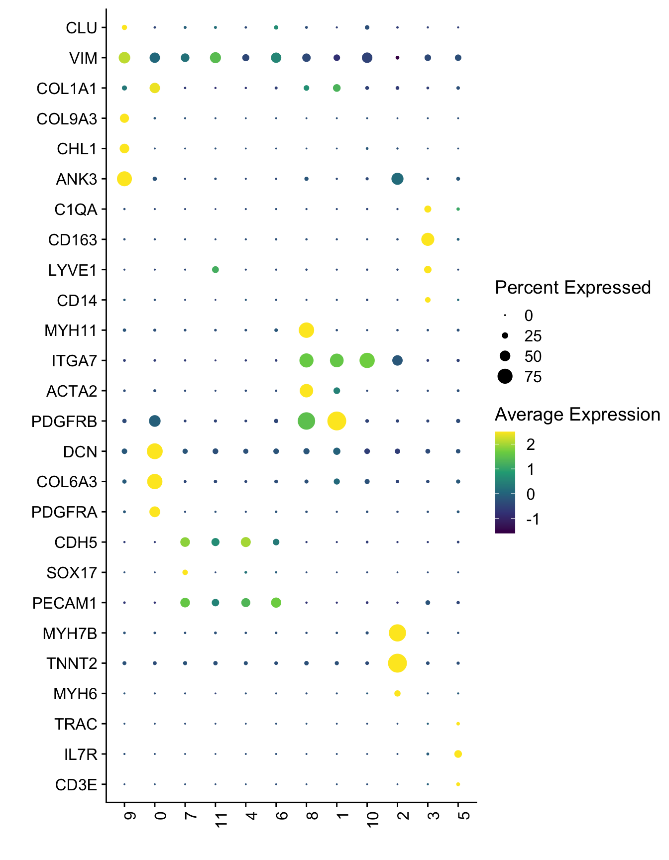 DotPlot(seurat, assay="RNA", features = selGenesAll$gene, scale =T,
