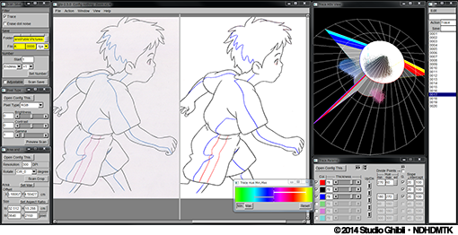 OpenToonzの元になったソフトウェア「Toonz」は、「もののけ姫」の一部のカットで使用されて以降、ほぼ全てのスタジオジブリ作品の仕上、色指定、撮影工程*に使われています。「借りぐらしのアリエッティ」以降は社内でもカスタマイズが行われ、制作スタイルに合わせてより使いやすく進化を重ねてきました。