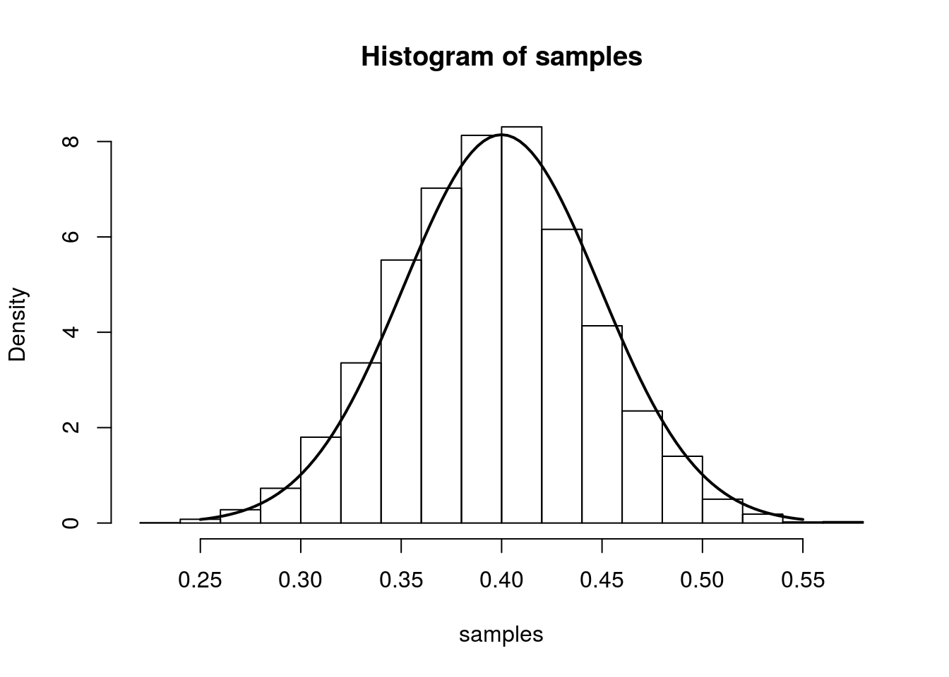 curve(dnorm(x, mean=p.truth,sd=sqrt((p.truth*(1-p.truth)/num.samples.per.iter) )), .25, .55, lwd=2, xlab = "", ylab = "", add = T)
