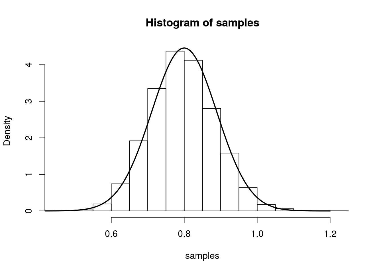 curve(dnorm(x, mean=lambda.truth,sd=sqrt(lambda.truth/num.samples.per.iter) ), 0.4, 1.2, lwd=2, xlab = "", ylab = "", add = T)