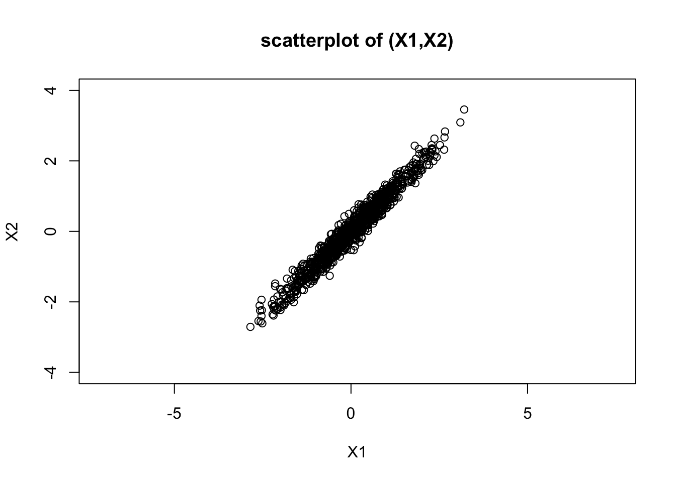 plot(X1,X2, main="scatterplot of (X1,X2)", ylim=c(-4,4), asp=1) #asp=1 sets the scales of X1 and X2 the same