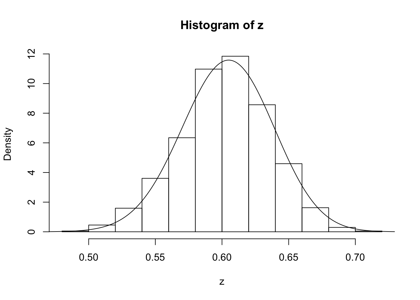 lines(x,dbeta(x,122, 80))  # overlays beta density on histogram