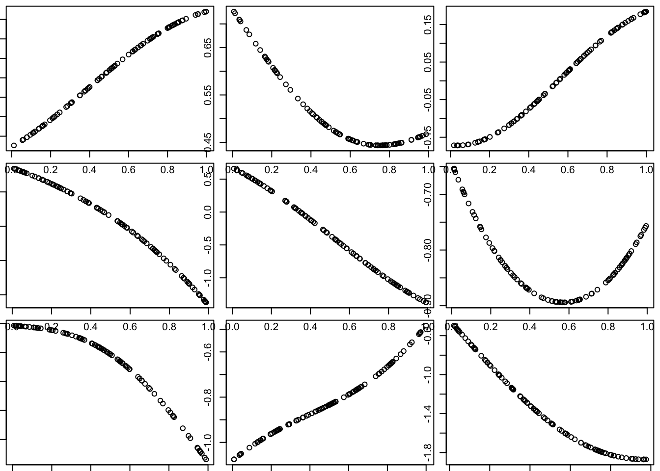 Of course, this is just one random curve (and only measured at 100 points, although conceptually it is defined at all points in the space). Here we generate nine different simulations: