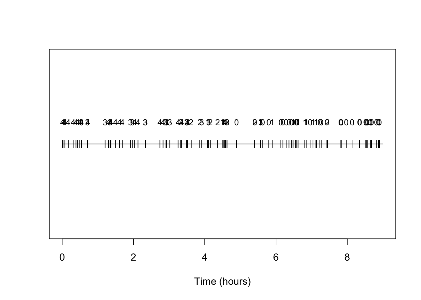 plot(c(0,t),c(0,0),type='l',xlab='Time (hours)',ylab='',yaxt='n');