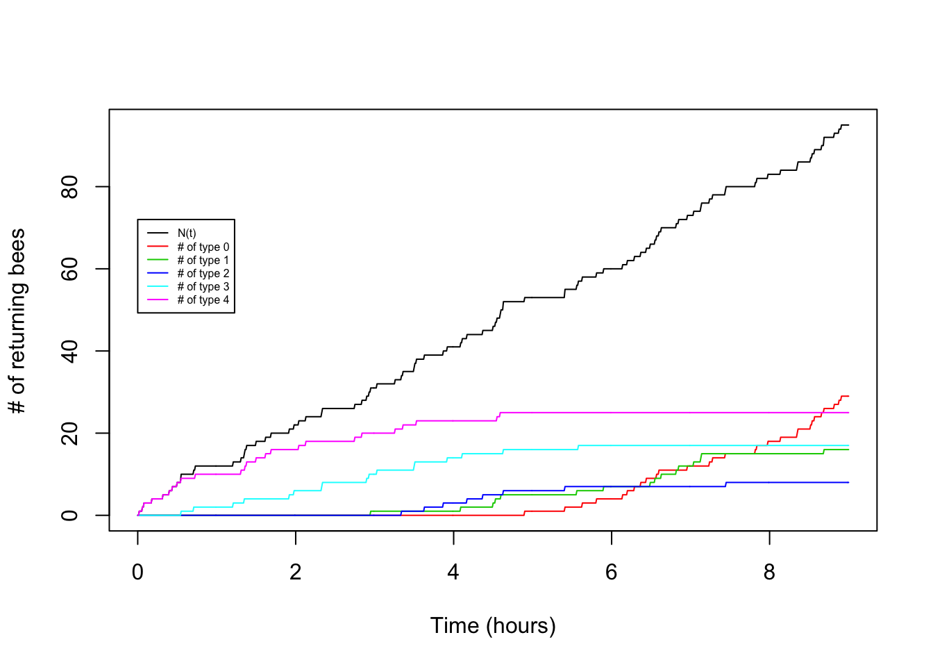 So if all goes well our Poisson Process result will help us derive the number of bees of each type at different time-points during the day. Going into this, we can expect that given \(b<0\) the beginning of the process will contain more type \(4\) individuals, and then later in the process it will decrease.