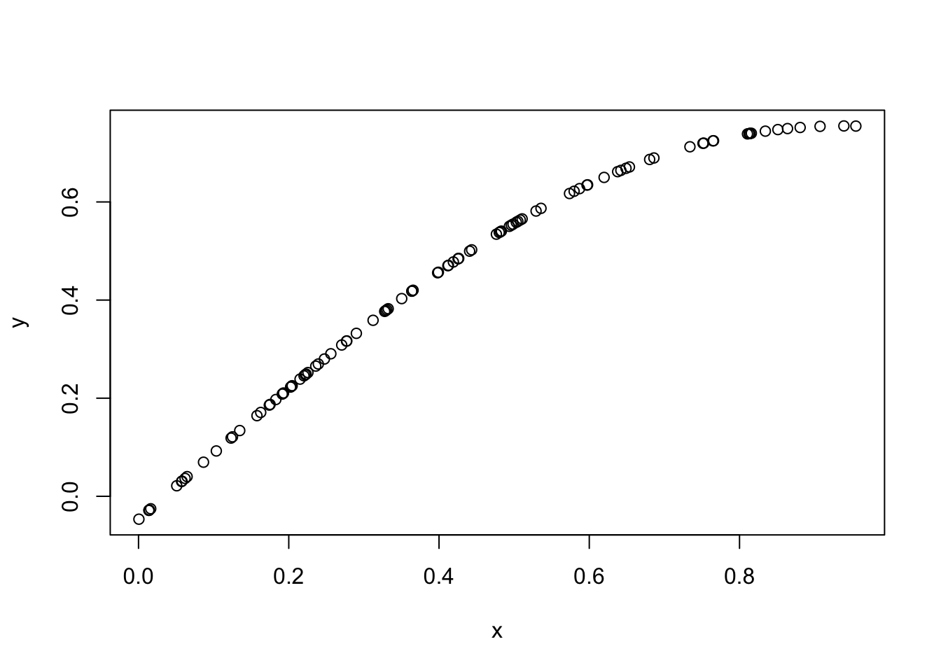 You can see that effectively this simulation has created a “curve” in which \(y\) varies smoothly with \(x\). Indeed, a GP can be thought of as a distribution on curves (whose smoothness depends on the covariance function used, as we will see later).