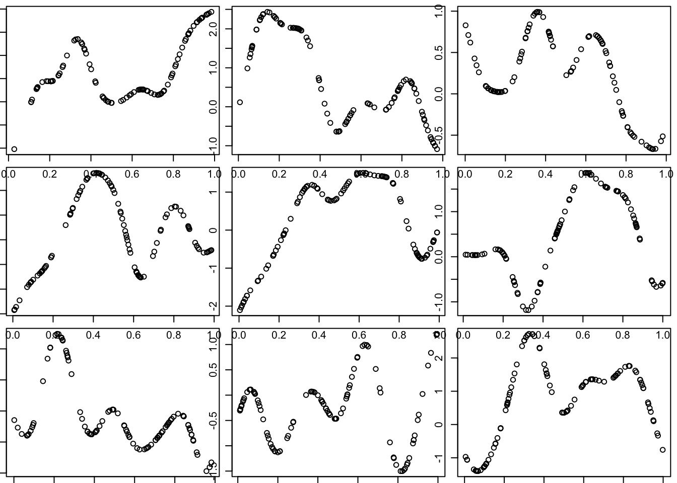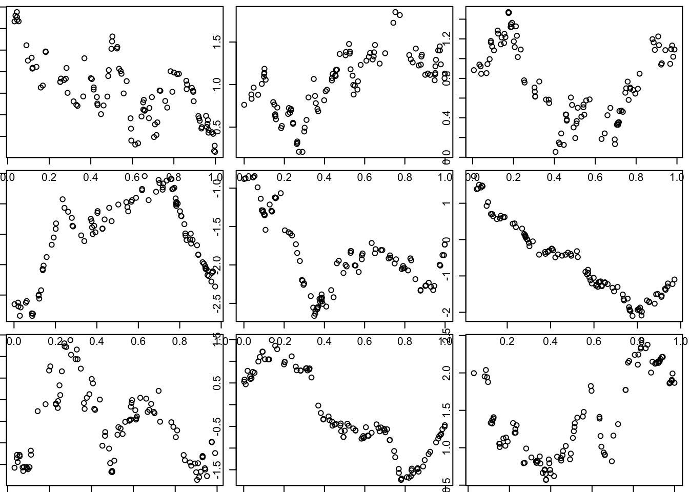 Of course, this is just one random curve (and only measured at 100 points, although conceptually it is defined at all points in the space). Here we generate nine different simulations: