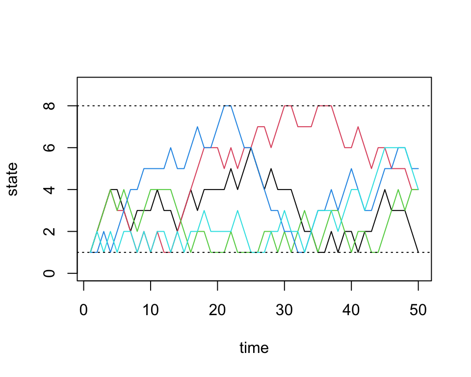 matplot(chain.states, type='l', lty=1, col=1:5, ylim=c(0,9), ylab='state', xlab='time')