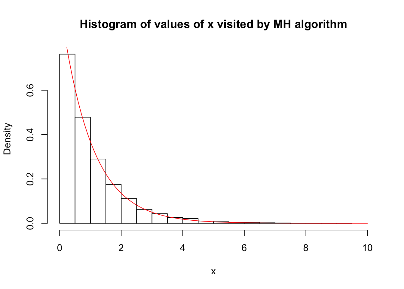 hist(x,xlim=c(0,10),probability = TRUE, main="Histogram of values of x visited by MH algorithm")