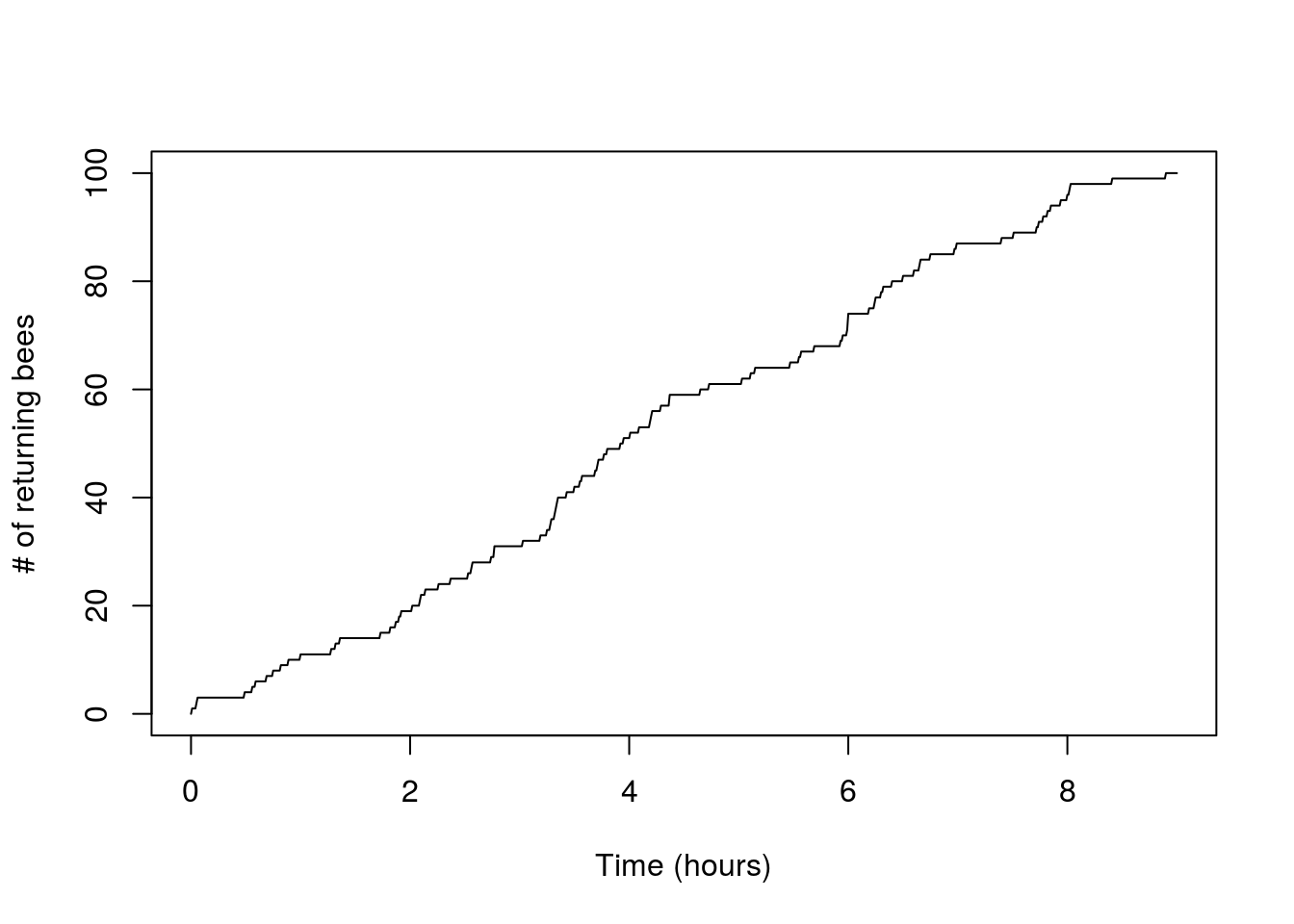plot(x,n_t,type='l',xlab='Time (hours)',ylab='# of returning bees')