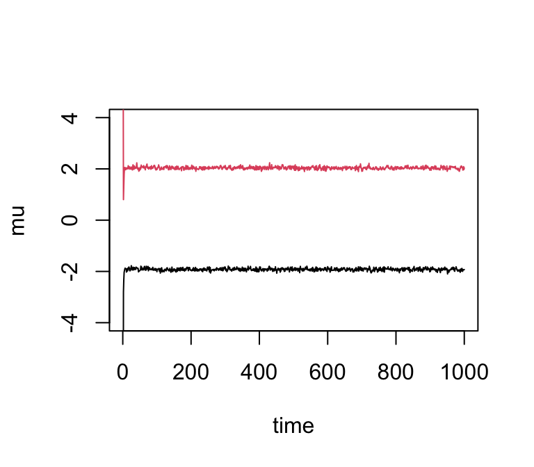 Try the Gibbs sampler on the data set we simulated above. We see it quickly moves to a part of the space where the mean parameters are near their true values (-2 and 2):