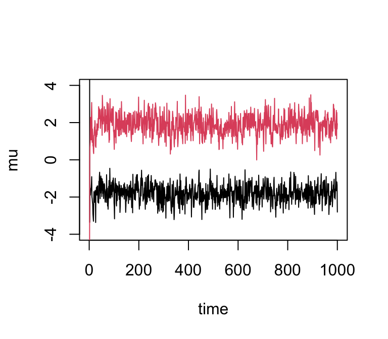 plot(res$mu[,1],ylim = c(-4,4),type = "l",xlab = "time",ylab = "mu")