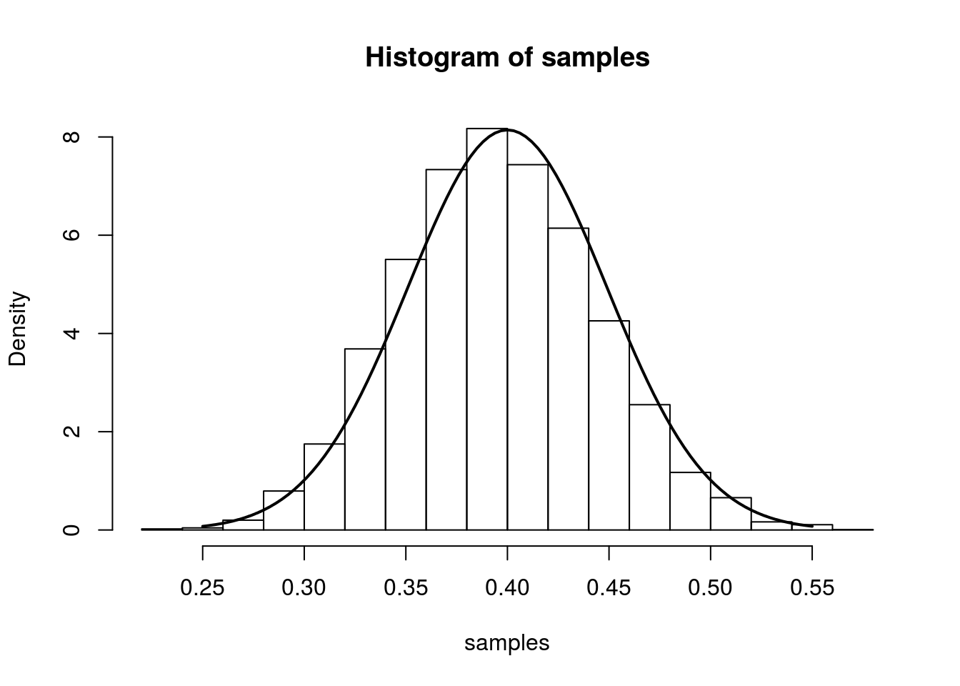 curve(dnorm(x, mean=p.truth,sd=sqrt((p.truth*(1-p.truth)/num.samples.per.iter) )), .25, .55, lwd=2, xlab = "", ylab = "", add = T)