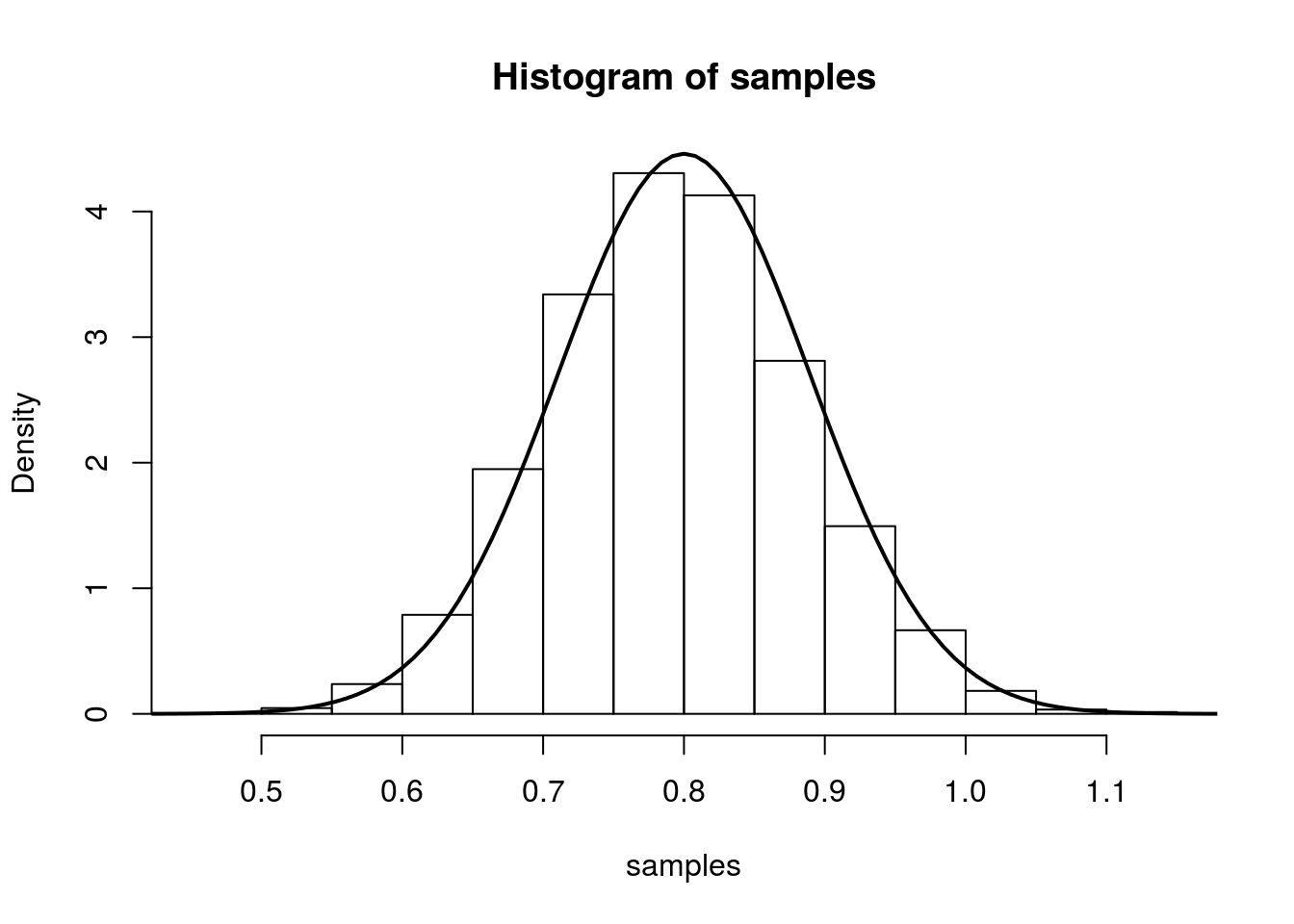 curve(dnorm(x, mean=lambda.truth,sd=sqrt(lambda.truth/num.samples.per.iter) ), 0.4, 1.2, lwd=2, xlab = "", ylab = "", add = T)