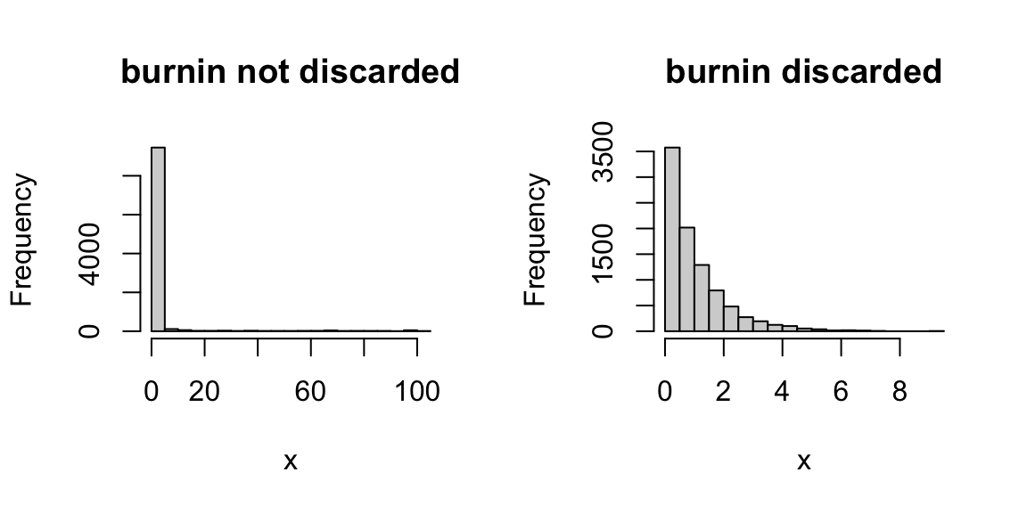 Based on the plot, we might discard the first 1,000 iterations or so as “burn-in”. Here are comparisons of the samples with and without burnin discarded: