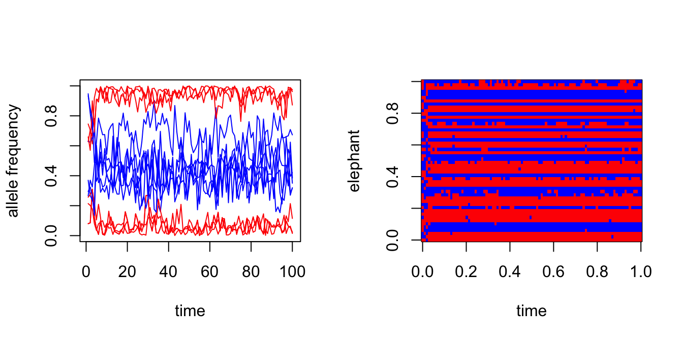 We will further assume that there are two type of elephant: forest elephants and savanna elephants, and that the allele frequencies in forest elephants are different from those in savanna elephants, but that the allele frequencies for each of these two groups are unknown. Also, we do not know which samples are forest elephants and which are savanna elehants. Our goal is to infer both these sets of unknowns: (i) which elephants are forest and which are savanna; (ii) what are the allele frequencies in each group of elephants.
