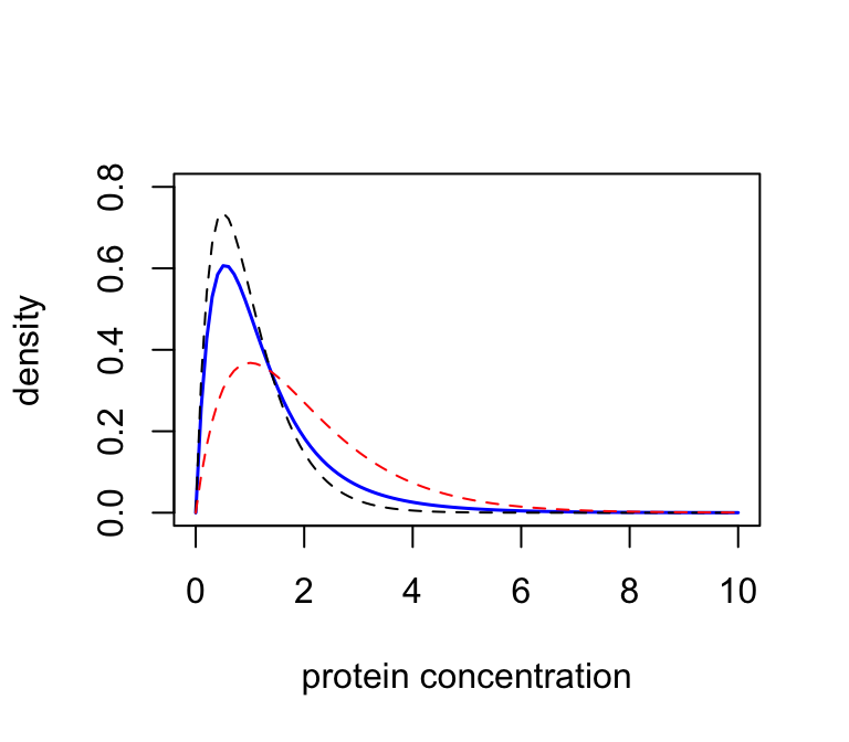 This distribution is an example of a “mixture distribution” (in particular, it is a “mixture of two Gamma distributions”). Here we plot the density of this mixture distribution (solid blue), as well as the densities of the individual distributions that were combined to make the mixture (the dashed black line for “normal”, the dashed red line for “diseased”). In mixture terminology, these individual distributions are called the “component distributions”.