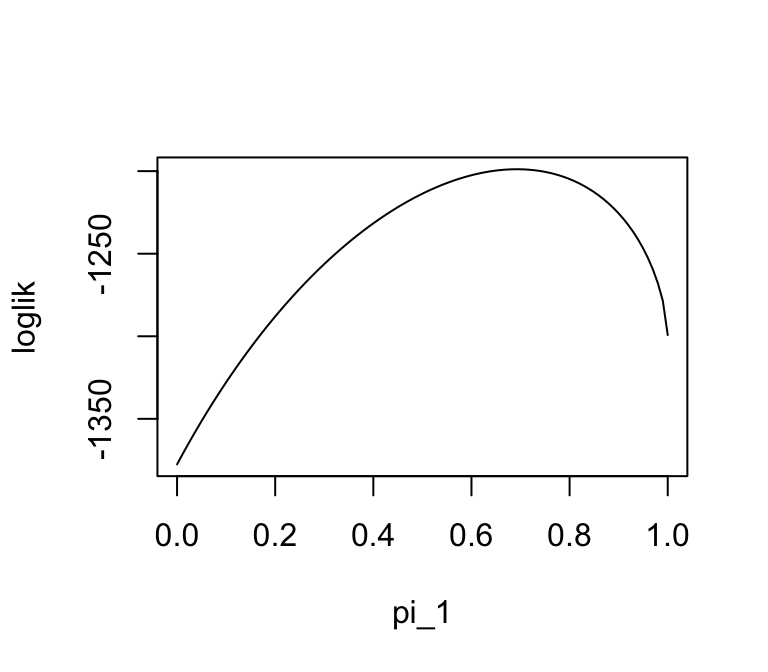 The following code simulates data from the model (with true value of \(\pi_1=0.7\)), then plots the log-likelihood.