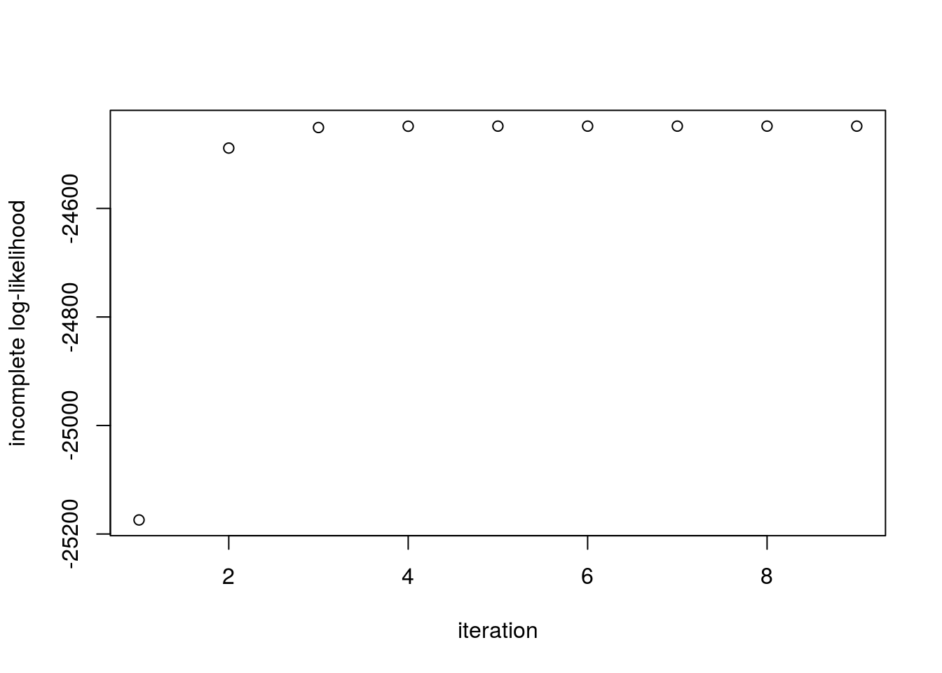 plot(ee[[2]], ylab='incomplete log-likelihood', xlab='iteration')