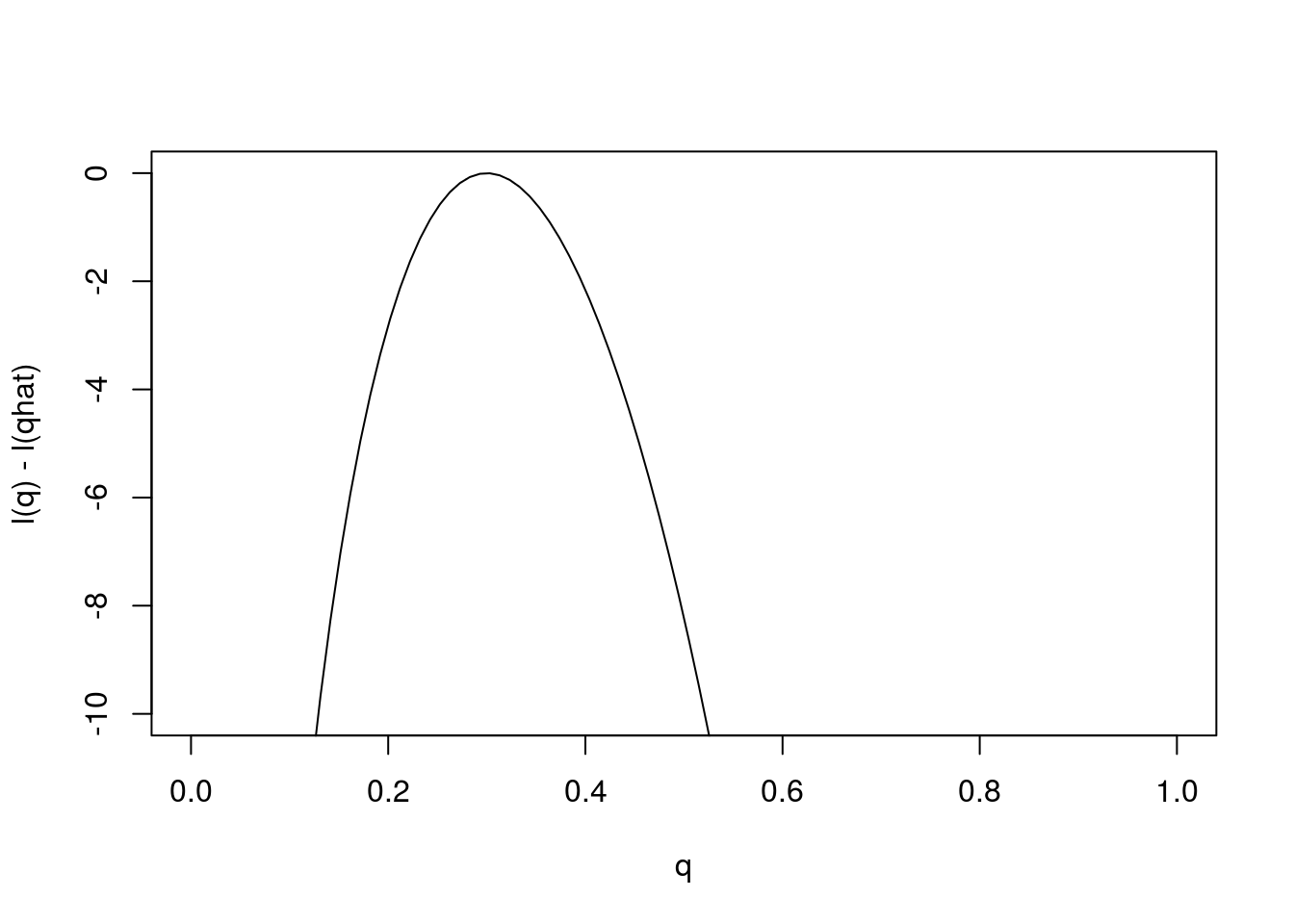 plot(q,l(q)-l(0.3),ylab="l(q) - l(qhat)",xlab="q",type="l",ylim=c(-10,0))