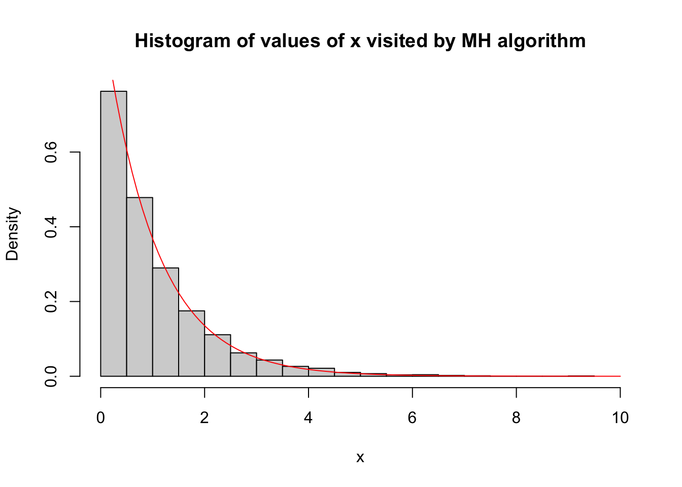To help understand the MH algorithm we now do a simple example: we implement the algorithm to sample from an exponential distribution: \[\pi(x) = \exp(-x) \qquad (x \geq 0).\] Of course it would be much easier to sample from an exponential distribution in other ways; we are just using this to illustrate the algorithm.