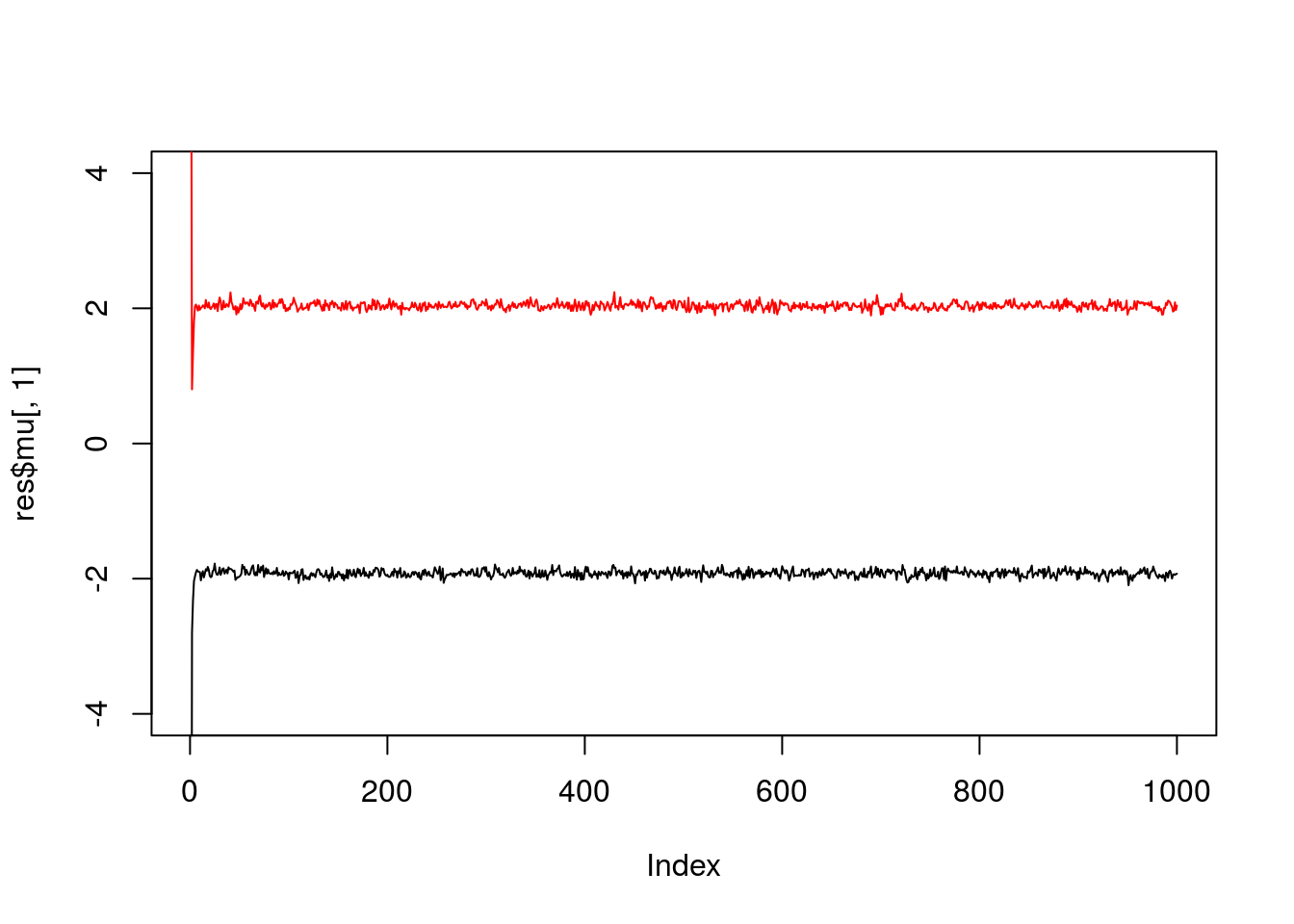Try the Gibbs sampler on the data simulated above. We see it quickly moves to a part of the space where the mean parameters are near their true values (-2,2).