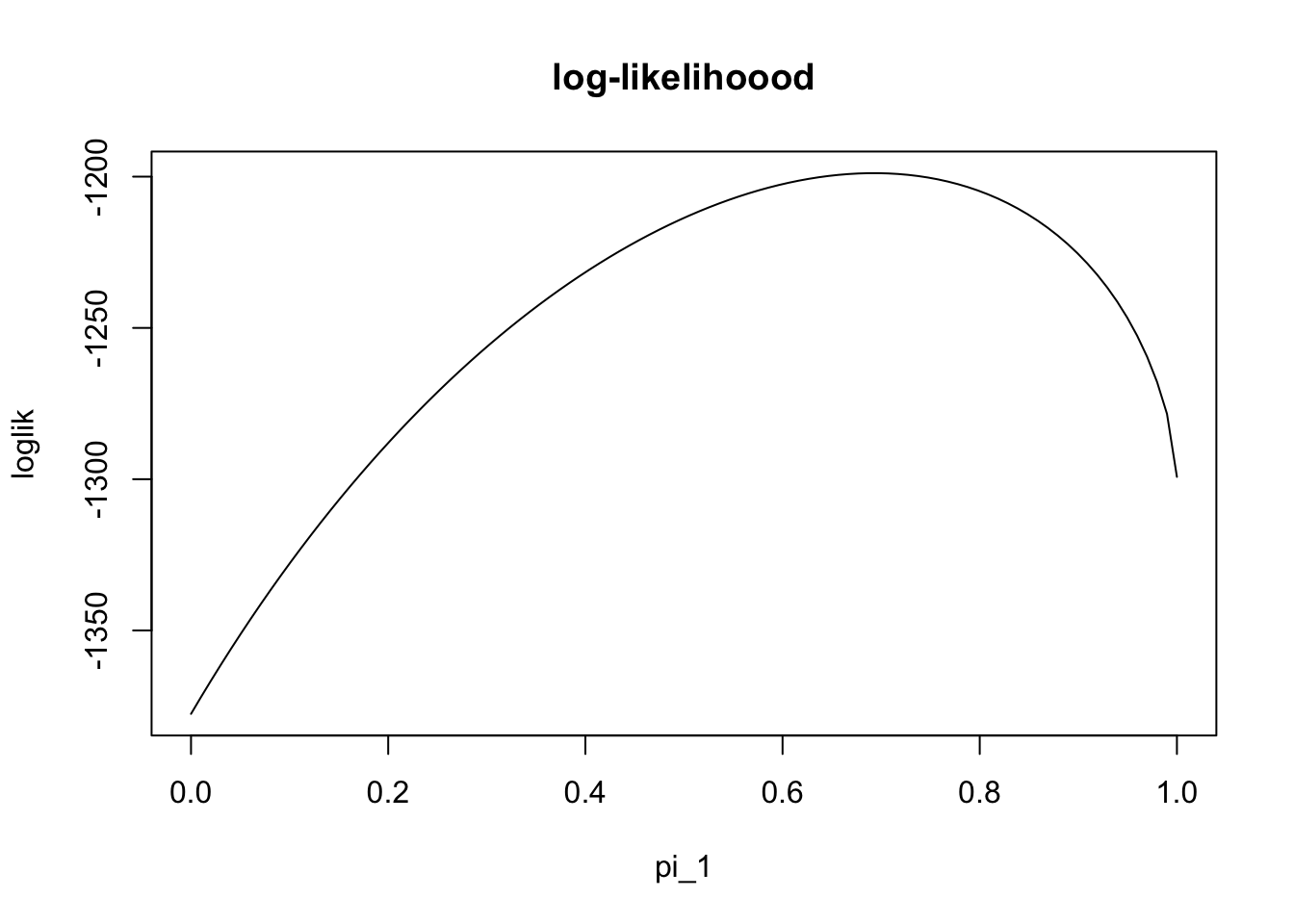 plot(pi1_vec, loglik, type="l", main="log-likelihoood", xlab="pi_1")