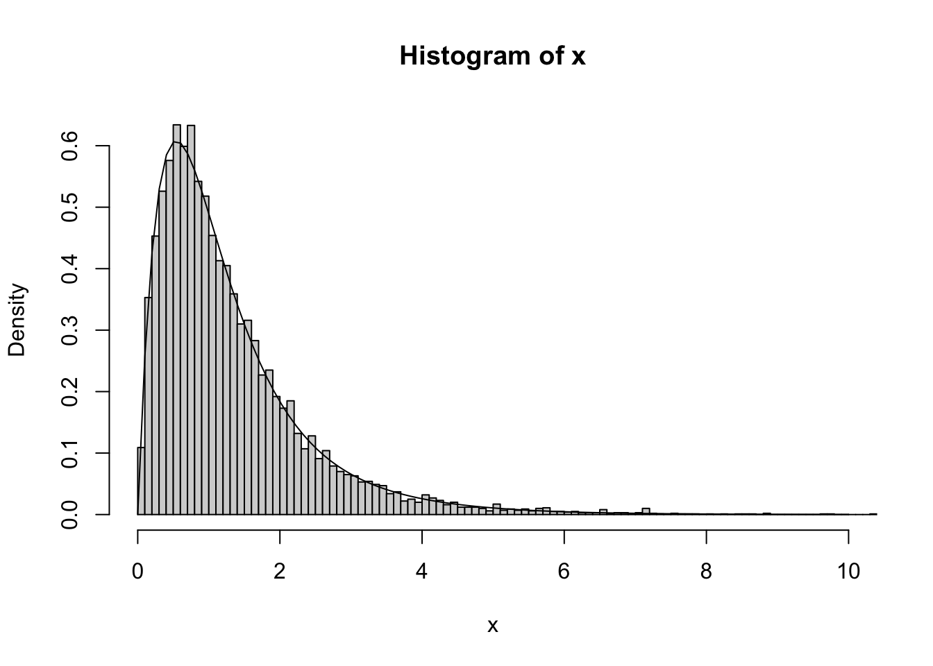 hist(x,nclass=100,xlim=c(0,10),probability=TRUE)