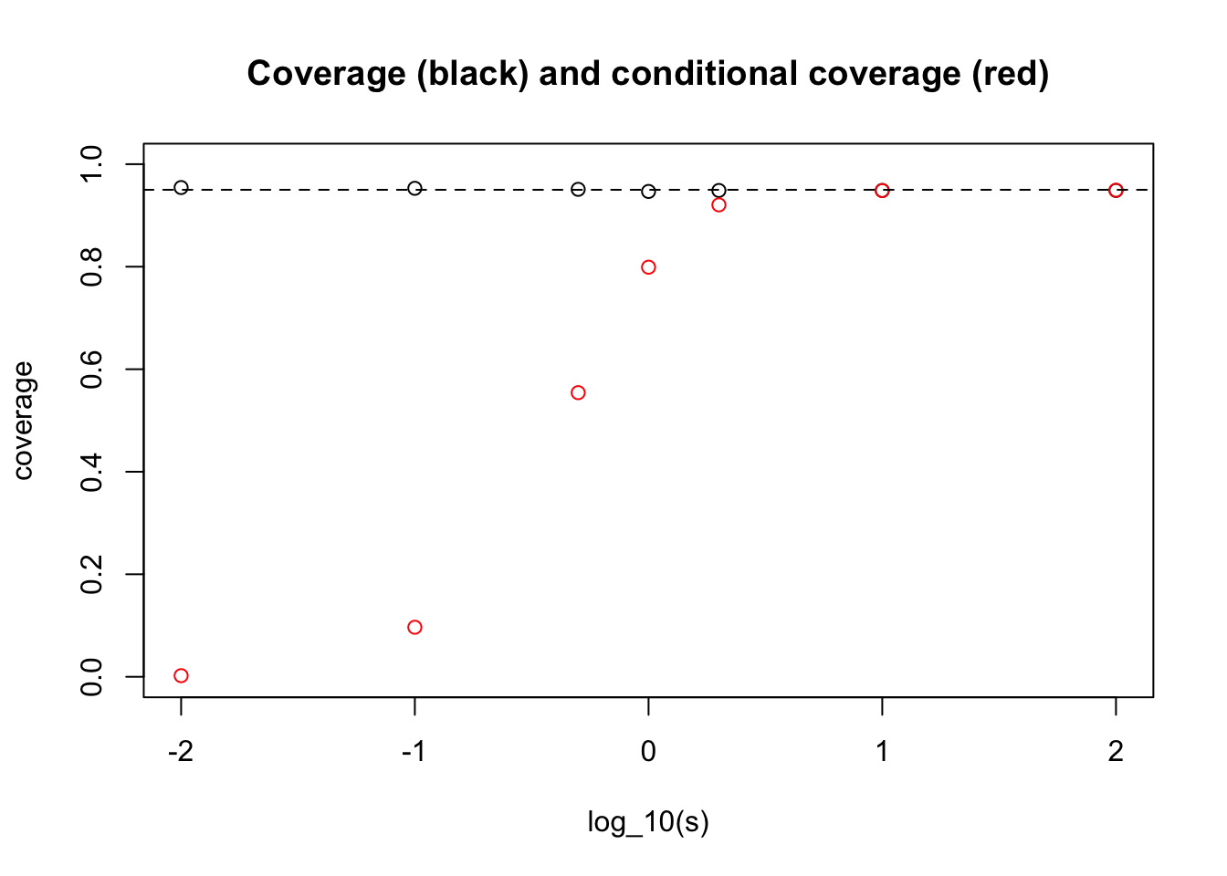 plot(log10(s),coverage,main="Coverage (black) and conditional coverage (red)", ylim=c(0,1), xlab="log_10(s)")