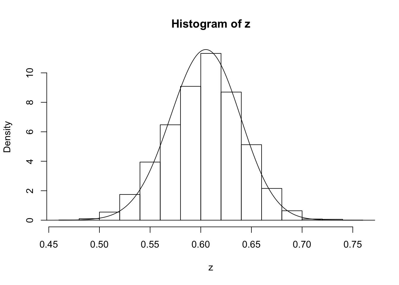 lines(x,dbeta(x,122, 80)) # overlays beta density on histogram