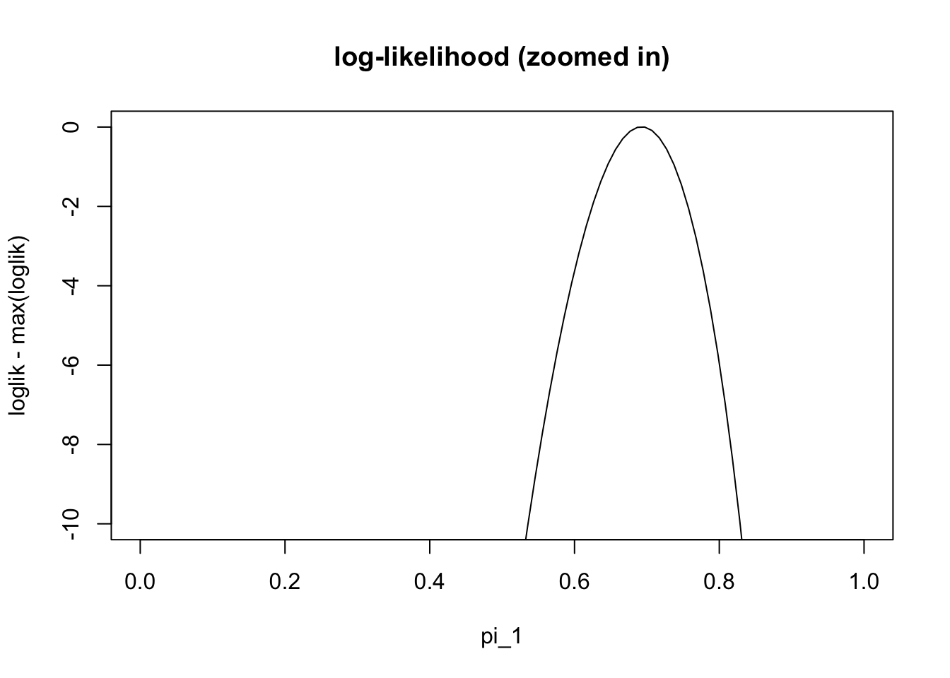 plot(pi1_vec,loglik-max(loglik), ylim=c(-10,0),type="l", main="log-likelihood (zoomed in)" , xlab="pi_1")