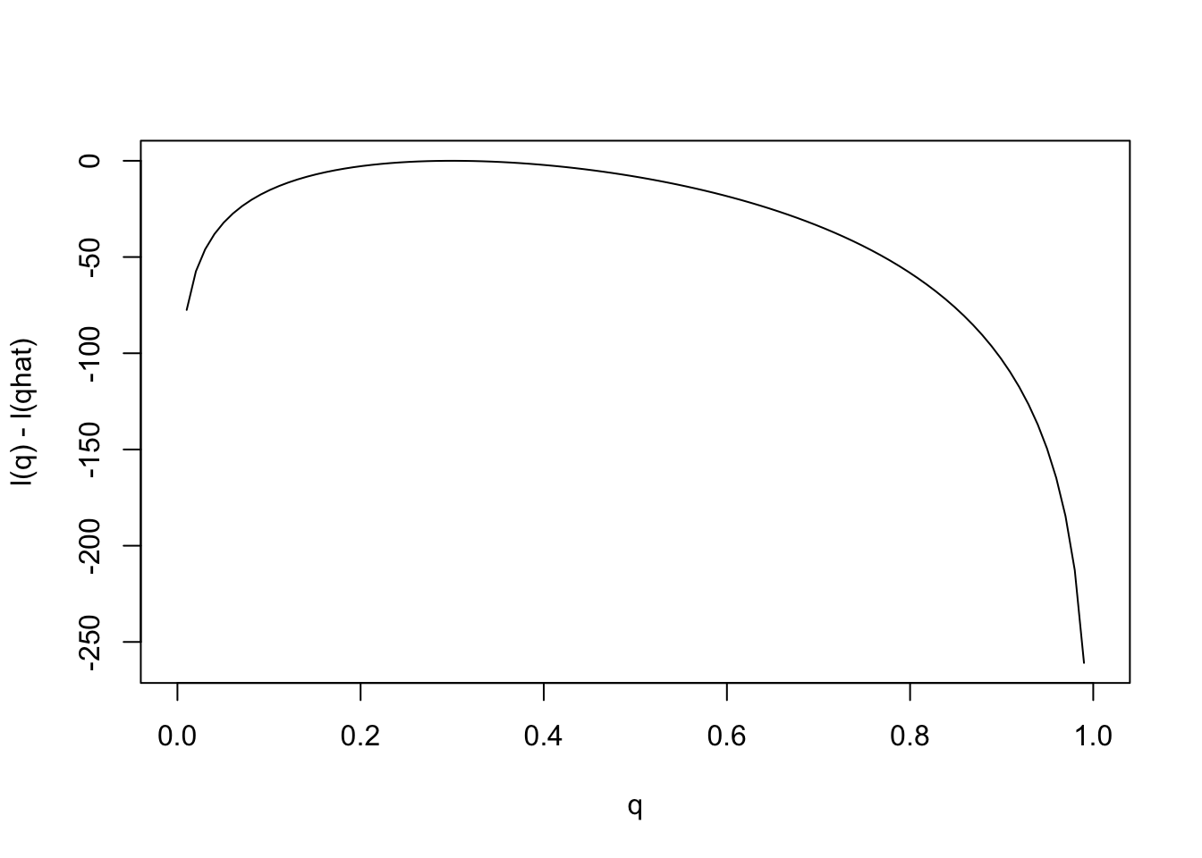 plot(q,l(q)-l(0.3),ylab="l(q) - l(qhat)",xlab="q",type="l",ylim=c(-10,0))