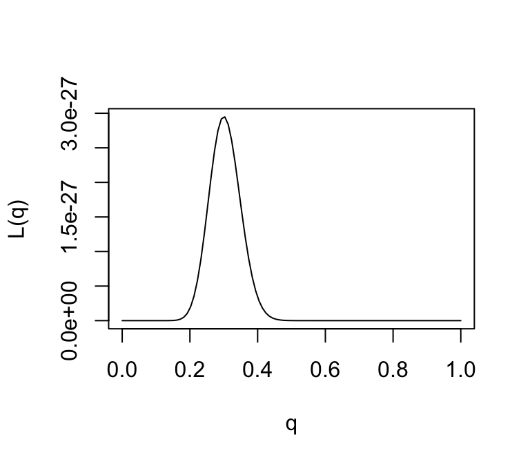 When computing likelihoods for parametric models, we usually dispense with the model notation and simply use the parameter value to denote the model. So instead of referring to the likelihood for \(M_q\) we just say the “likelihood for \(q\)”, and write \(L(q)\). So the likelihood for \(q\) is given by \[ L(q) = q^{30} (1-q)^{70}. \] Correspondingly, we can also refer to the “likelihood ratio for \(q_1\) vs. \(q_2\)”.