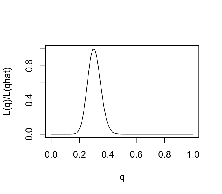 Note that, for some values of \(q\), the likelihood ratio compared with \(q=0.3\) is very close to zero. These values of \(q\) are so much less consistent with the data that they are effectively excluded by the data. Just looking at the picture we might say that the values of \(q\) less than 0.15 or bigger than 0.5 are pretty much excluded by the data. We will see later how Bayesian analysis methods can be used to make this kind of argument more formal.