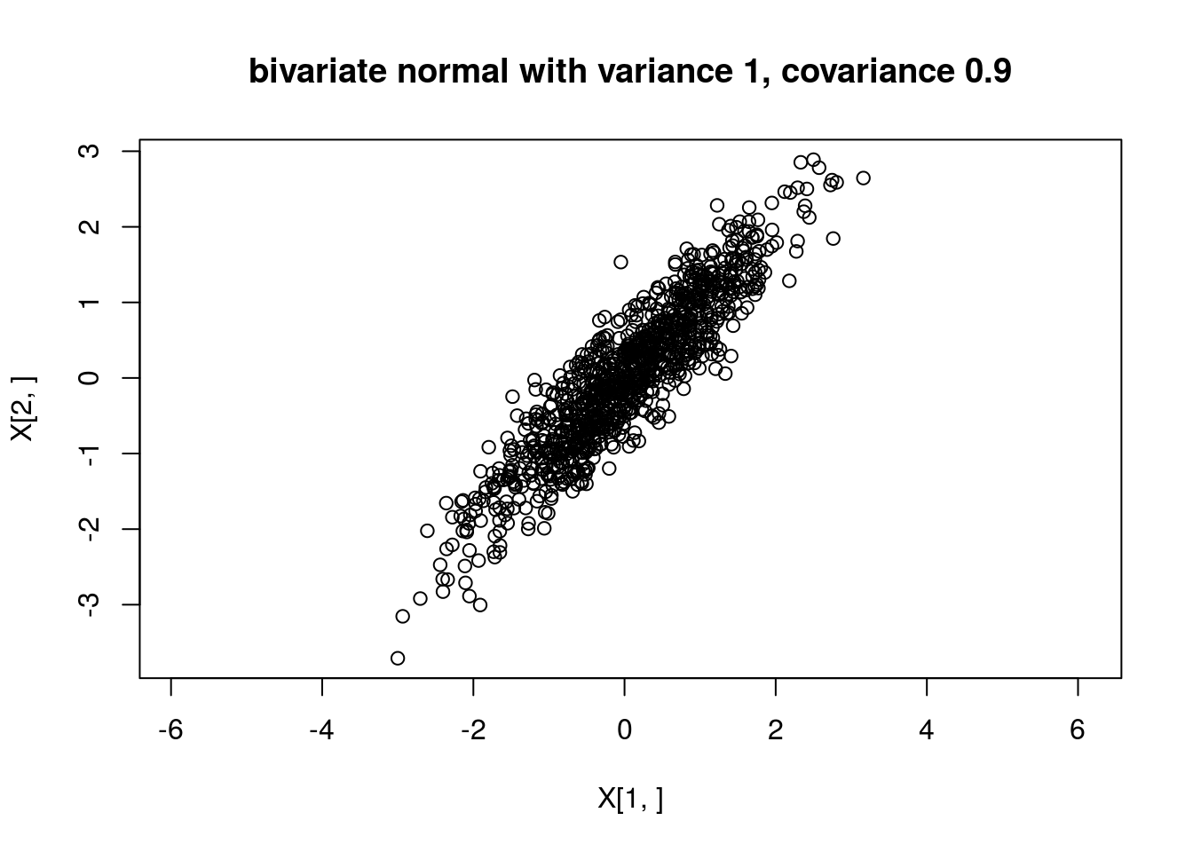 plot(X[1,],X[2,],main="bivariate normal with variance 1, covariance 0.9",asp=1)