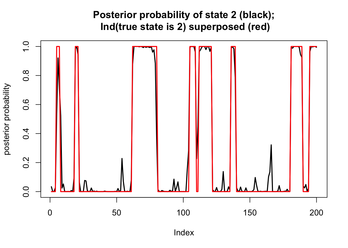 plot(prob[,2],type="l",ylim=c(0,1), main="Posterior probability of state 2 (black);\n Ind(true state is 2) superposed (red)",lwd=2,ylab="posterior probability")