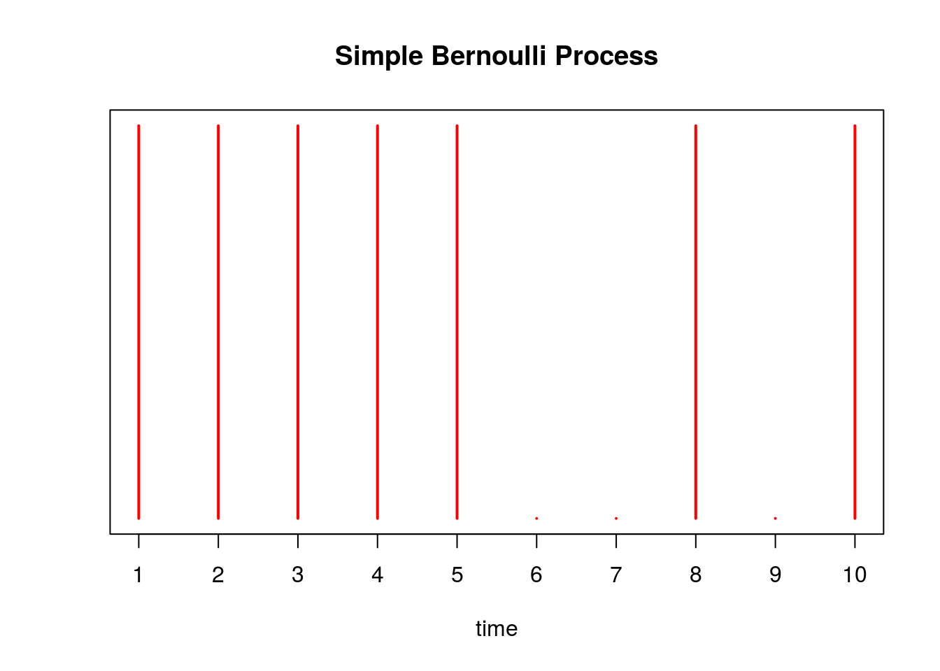 col='red', lwd=2, ylab='', xlab='time', main='Simple Bernoulli Process')