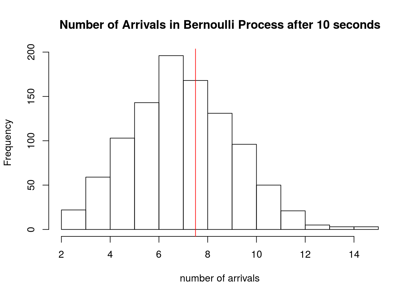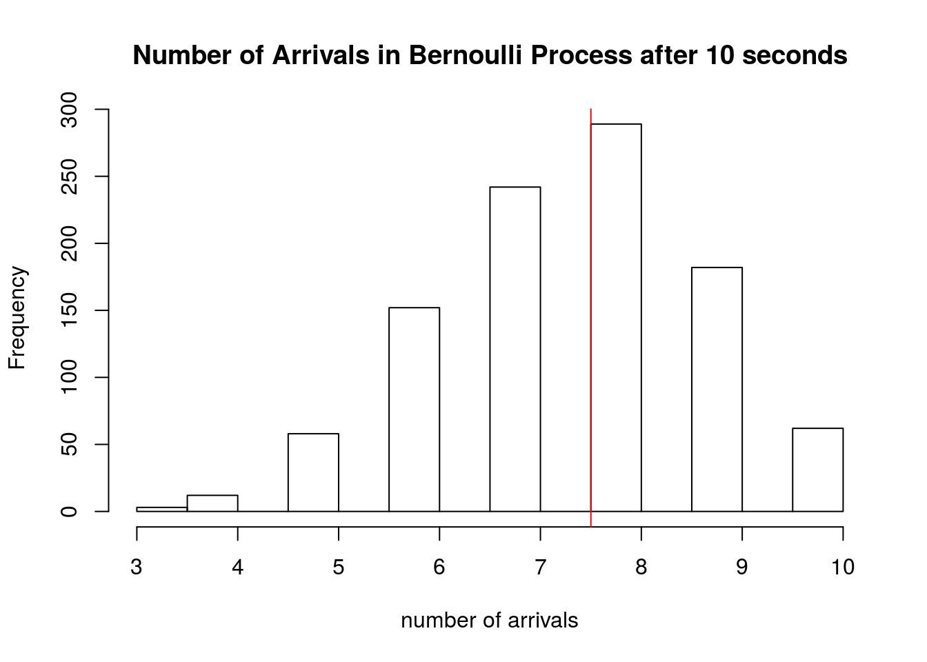 hist(sapply(1:1000, function(x) sum(rbinom(10,1,0.75))), xlab='number of arrivals', main='Number of Arrivals in Bernoulli Process after 10 seconds')