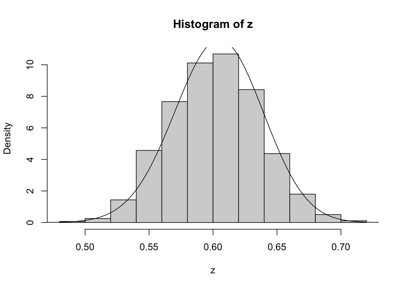 lines(x,dbeta(x,122, 80)) # overlays beta density on histogram