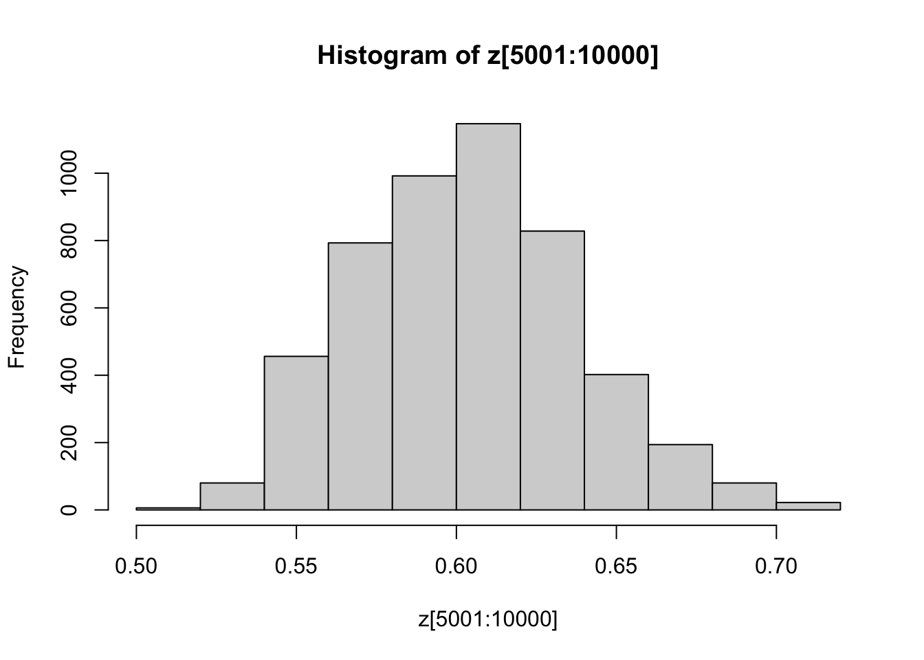 You might also like to discard the first 5000 z’s as “burnin”. Here’s one way in R to select only the last 5000 z’s